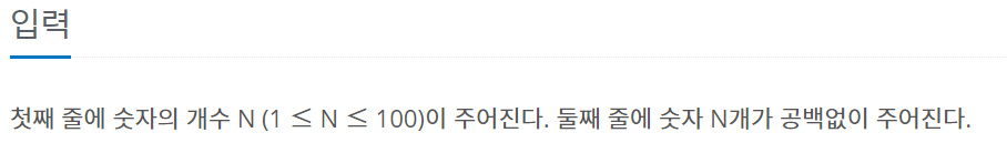 첫째 줄에 숫자의 개수 N (1 ≤ N ≤ 100)이 주어진다. 둘째 줄에 숫자 N개가 공백없이 주어진다.