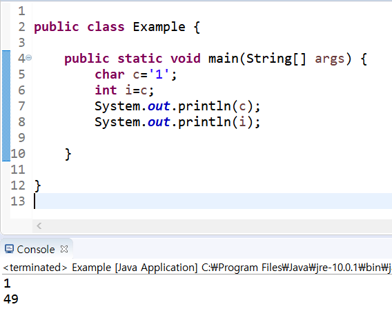 위의 예시에서 보면 c에 문자 1을 담았고 이것을 다시 int i에 담았다. 이를 출력해보면 c는 문자 1이 출력되고 i는 49가 출력이 된다. 아스키 코드를 보자