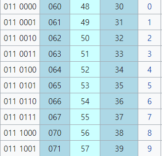 아스키코드를 보면 문자 1은 컴퓨터 상에서 이진수 011 0001로 저장된다. 이를 int로 변환하면 011 0001을 십진수로 변환한 49가 출력이 되는거다.