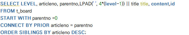 3. parentNo가 0이 아닌 row는 상위 row 에서 aritcleNo가 parentNo와 일치하는 행을 찾아 그 행 아래로 (PRIOR articleNo = parentNo)