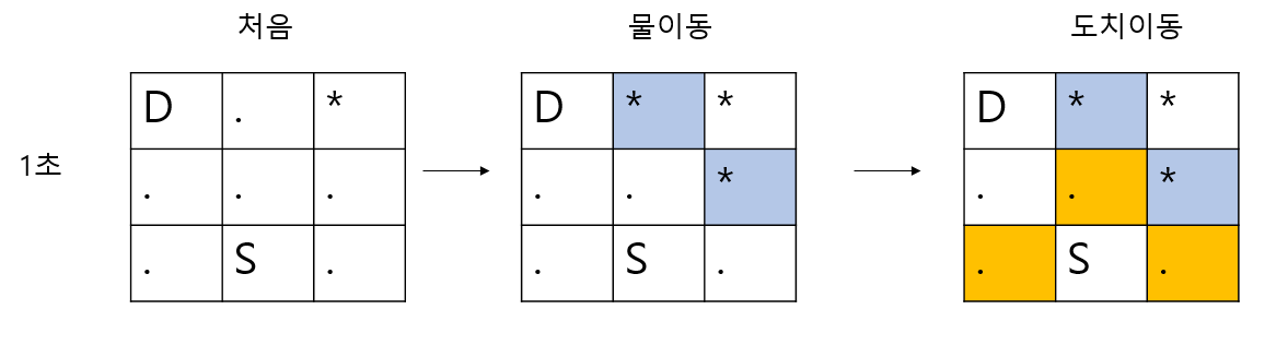 물과 고슴도치가 이동할 수 있는 조건이 다르므로 (물은 동굴을 지나갈 수 없고, 고슴도치는 동굴을 지나갈 수 있다) 물이 이동하는 위치를 넣는 큐하나와 고슴도치가 이동하는 큐하나, 총 2개의 큐를 이용해 bfs를 진행하면 된다.