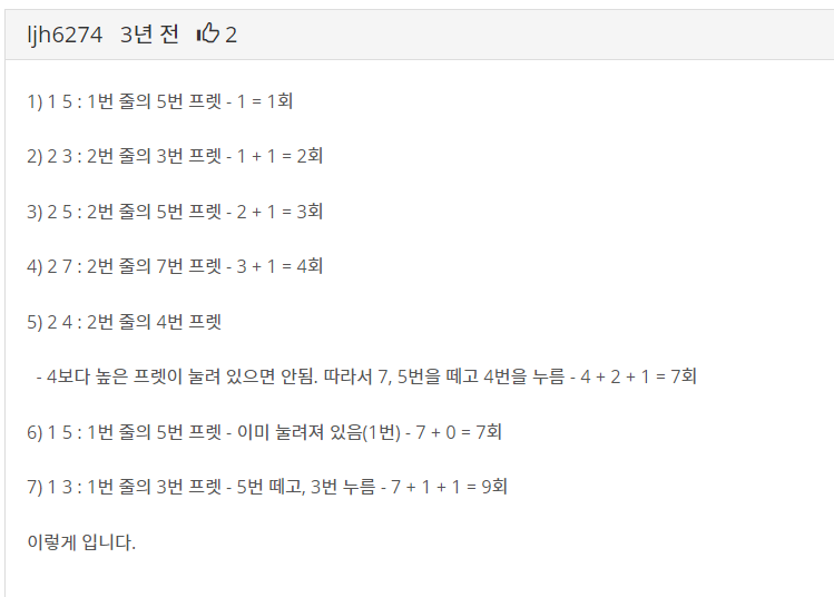 스택으로 풀라는 힌트가 없었으면 못풀었을 것같다. 그리고 문제를 이해하는데 좀 오래 걸렸는데, 줄 번호가 높을 수록 음도 높아지는 줄 알았다. 그래서 처음엔 1,5/2,3/이걸 15, 23으로 변환해서 stack에 push pop하는 걸로 풀려고 했는데 아무리 해도 11이 나와서 결국에는 질문게시판에 있는 예제 해설을 보고 풀었다.