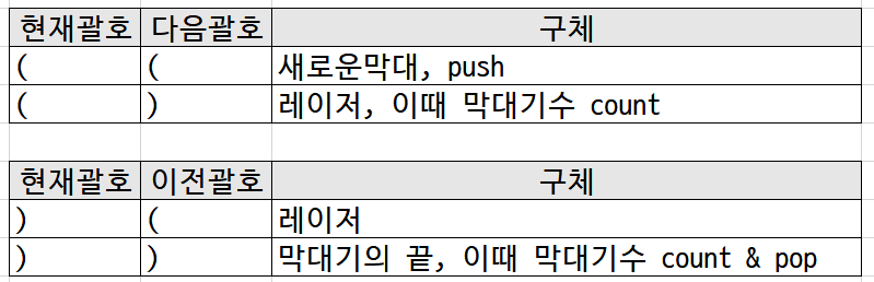 - ( 이 나오는 경우: 가능성이 두가지다. 레이저가 될 수도 있고 막대기의 시작이 될 수도 있다. 레이저가 되는 경우는 다음에 오는 괄호가 )인경우이고 막대기의 시작이 되는 경우는 다음에 오는 괄호가 (인 경우이다