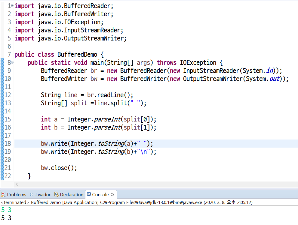 readLine의 입력단위는 한 줄이다. 따라서 한 줄에 2개의 입력값이 있는 경우에는 이를 따로 분리해주는 추가 작업이 필요하다. 많이 사용하는 방법은 StringTokenizer를 사용하거나 String의 split함수를 사용하는 방법 2가지이다.